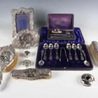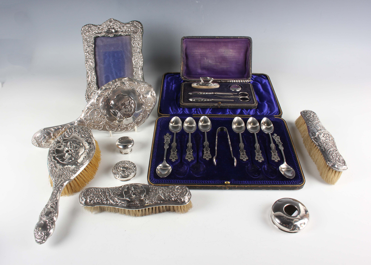 A set of eight Edwardian silver teaspoons and pair of matching sugar tongs, with pierced and engraved handles, Sheffield 1907, and a group of other silver, including a three-piece dressing table set, a clothes brush, a photograph frame and a four-piece manicure set, weighable items 196.7g.