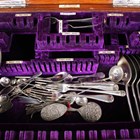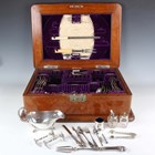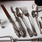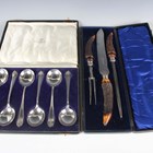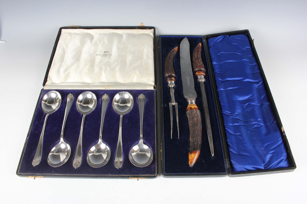 A group of plated items, including a stag's antler handled three-piece carving set with silver ferules, comprising knife, fork and steel, Sheffield 1907, cased, a set of six Queen Anne pattern soup spoons by Walker & Hall, cased, and a sauceboat, together with a small group of silver, weight 70g.