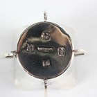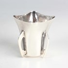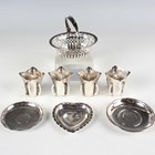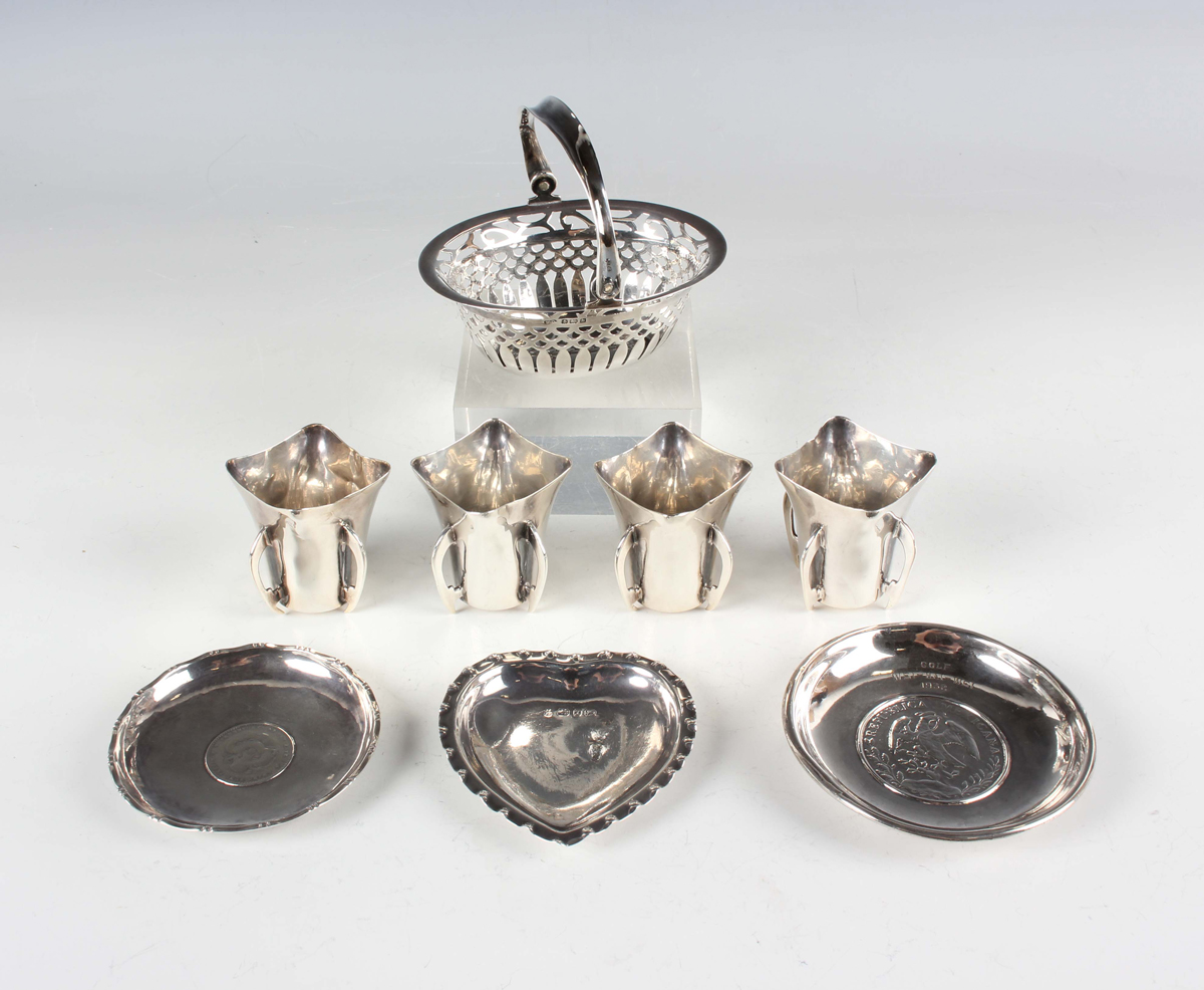 A set of four George V Irish silver shot cups, each of tapering square form with four loop handles, Dublin 1912 by West & Son, height 4.3cm, and a small group of other silver, including a bonbon basket with swing handle above pierced sides, Birmingham 1907, and a heart shaped pin dish, Birmingham 1897, total weight 222.1g.