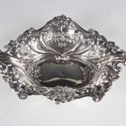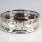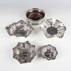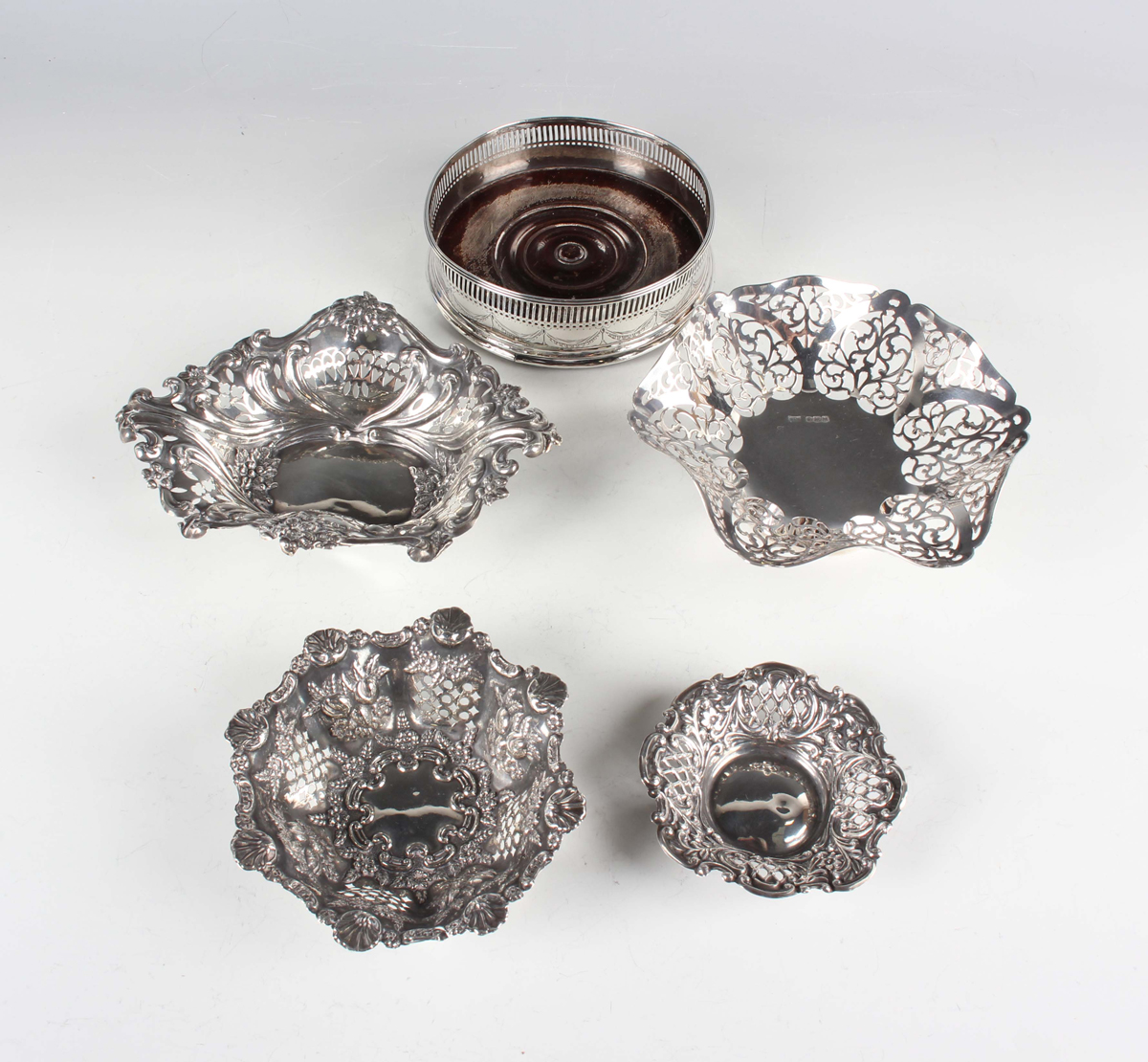 An Edwardian silver shaped oval bonbon dish, pierced and embossed with scrolling tendrils, Chester 1901, length 17cm, three other silver bonbon dishes, various dates and makers, total weight 236.3g, and a George III silver wine coaster, pierced and engraved with festoons, London 1787, diameter 12cm.