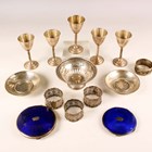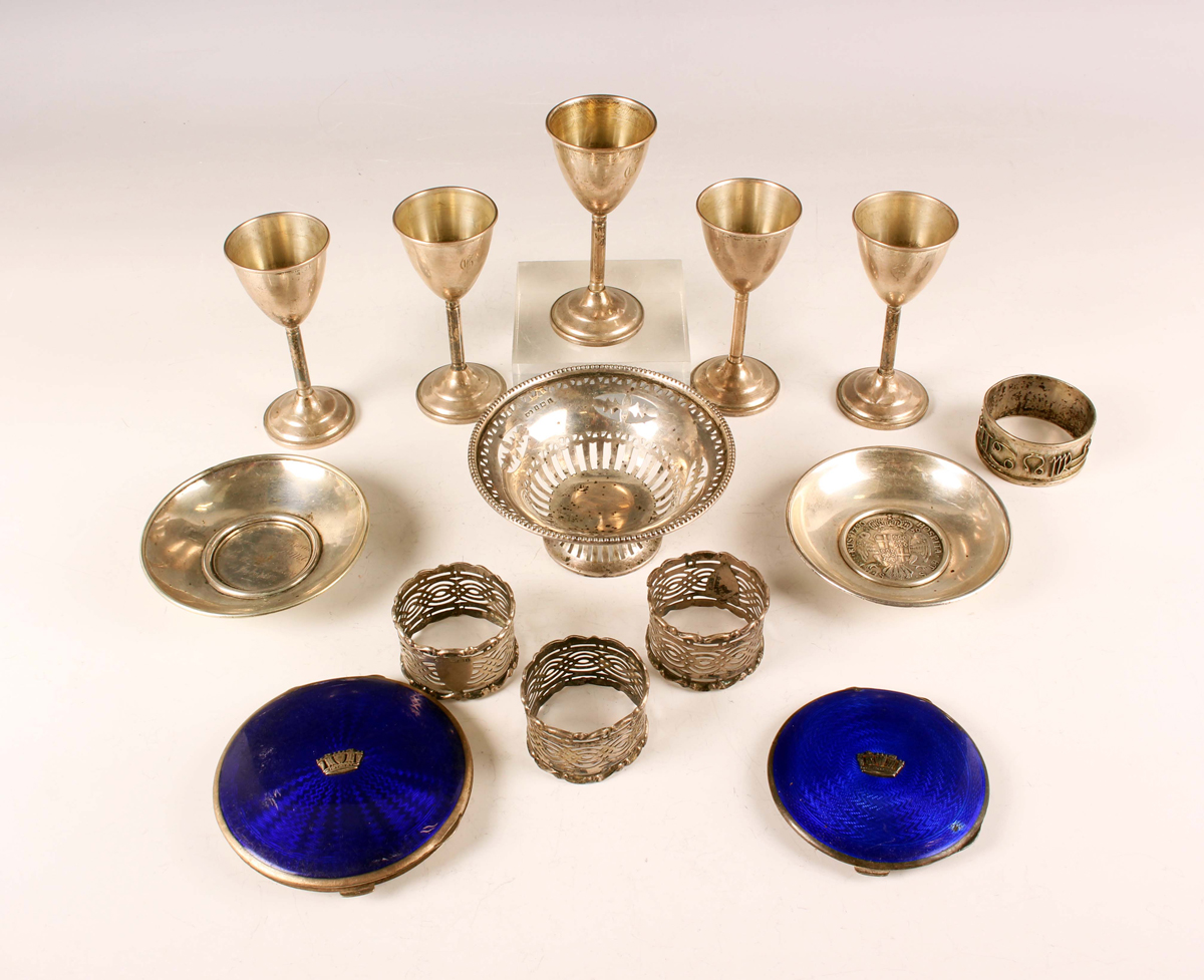 An Edwardian silver circular bonbon dish with pierced sides, on a pierced circular base, Birmingham 1907, diameter 10.3cm, and a small group of other silver, including a set of three napkin rings and two blue enamelled compacts, weighable items 262.9g, together with a set of five American sterling shot cups, each of ovoid form on a cylindrical stem, on a weighted circular foot, by Newburyport Silver Co, New Hampshire, height 9.7cm.