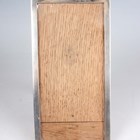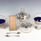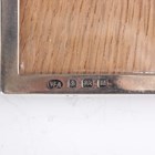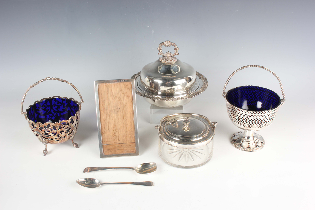 A George V silver rectangular photograph frame with oak easel back, Birmingham 1911 by William Aitken, height 15.7cm, a silver teaspoon and another silver spoon, total weight of spoons 39.6g, together with a small group of plated items, including sugar baskets and a muffin dish and cover.