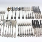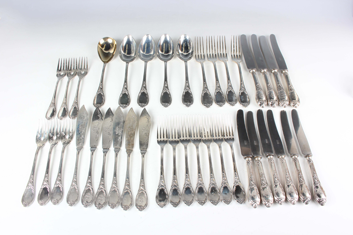 A German part canteen of .800 silver cutlery, comprising four tablespoons, four table forks, seven dessert forks, six fish knives and forks and a serving spoon, total weight 1591g, together with four matching silver handled table knives and six dessert knives, with steel blades.