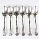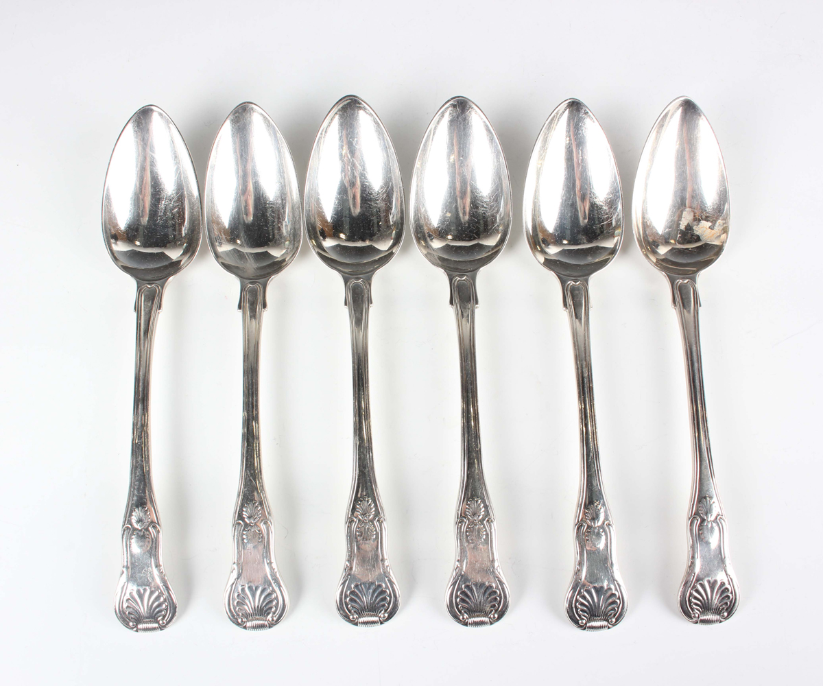 A set of six George III and later silver King's pattern tablespoons, London 1818 and 1824 by William Bateman I, total weight 623.7g, length 23.2cm.