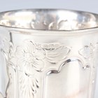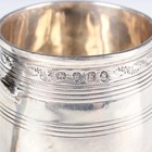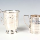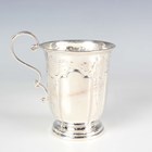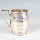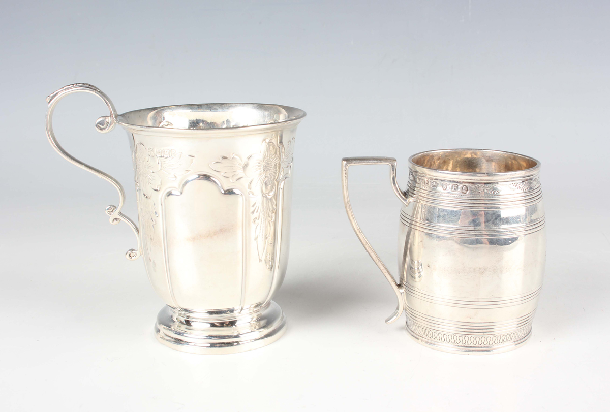 A George III silver christening mug of barrel form with horizontal reeded and engraved decoration, flanked by an angular handle, London 1801 by John Emes, height 6.3cm, and another silver christening mug of tapering cylindrical form, engraved with flowers, Sheffield 1900 by James Deakin & Sons, height 9.3cm, total weight 180g.