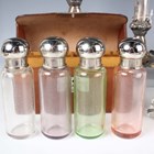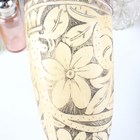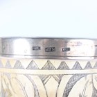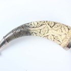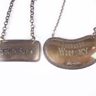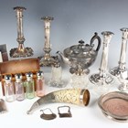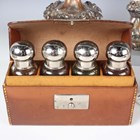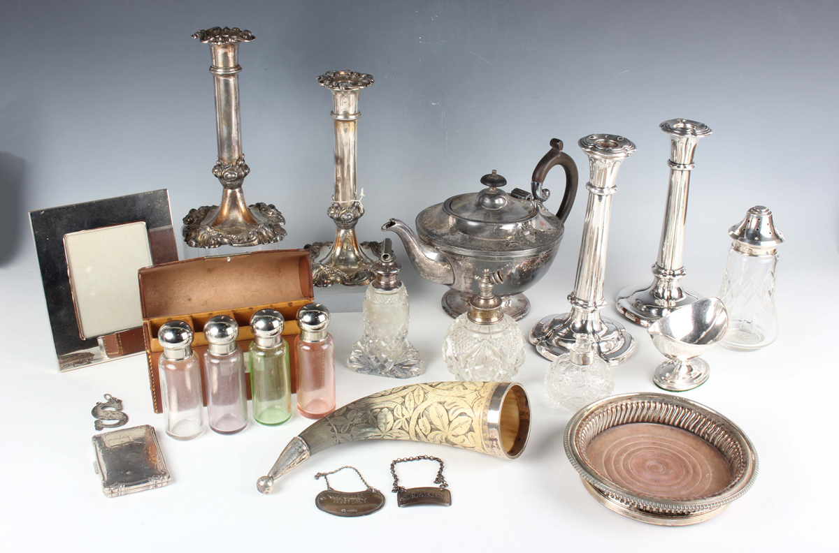 An Icelandic .828 silver mounted horn drinking cup, carved with flowers, length 24.5cm, and two silver decanter labels, comprising 'Irish Whiskey', Birmingham 1906, and 'Sherry', London 1817, together with a group of plated items, including a wine coaster, two pairs of candlesticks and a set of four tinted and clear glass bottles and stoppers, each with a screw top, within a brown leather case.