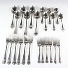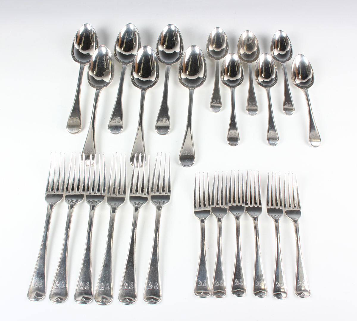 A set of six George III silver Old English Thread pattern tablespoons and six matching dessert spoons, London 1819 by William Eley I & William Fearn, and a matched set of six silver Old English Thread pattern table forks and six dessert forks, London 1810, 1815 and 1817, various makers, total weight 1500g.