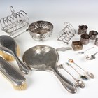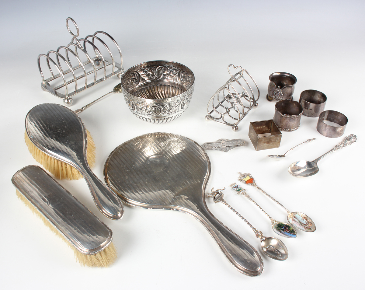 A small group of silver, including a circular bowl, embossed with foliate scrolls, London 1907, diameter 11.8cm, a three-piece dressing table set, a toast rack with four heart shaped divisions, Birmingham 1896, and five napkin rings, weighable items 453.6g, together with three .800 silver souvenir spoons and a plated toast rack.