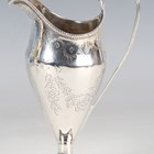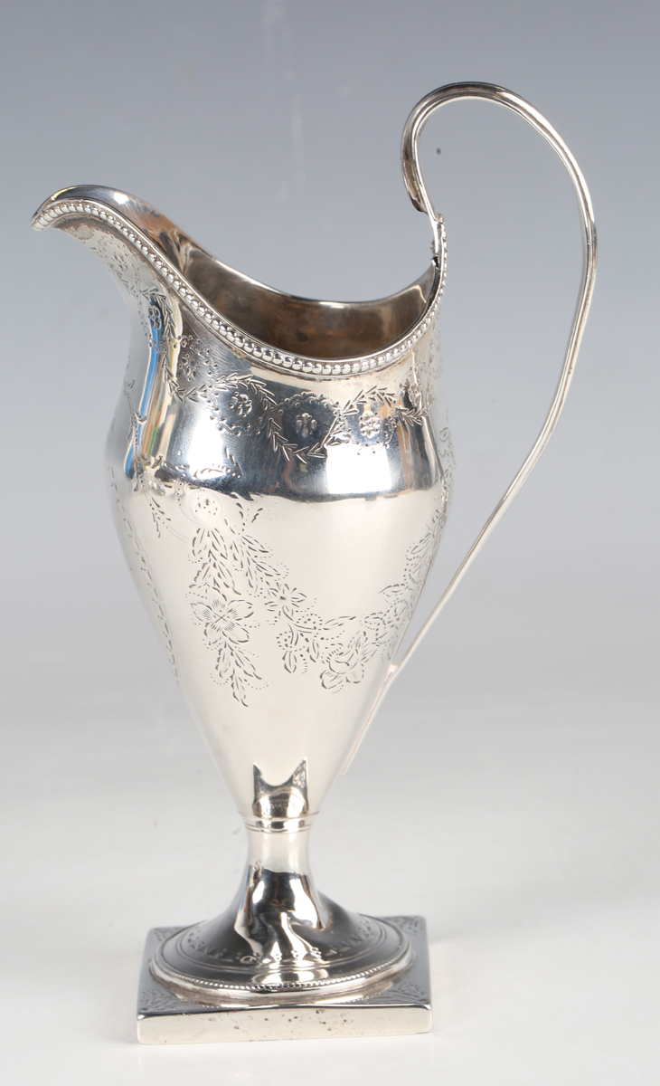 A George III silver helmet cream jug with engraved decoration, beaded rim and reeded loop handle, on a circular base and square foot, London 1786, maker's mark indistinct, weight 134g, height 17cm.