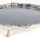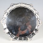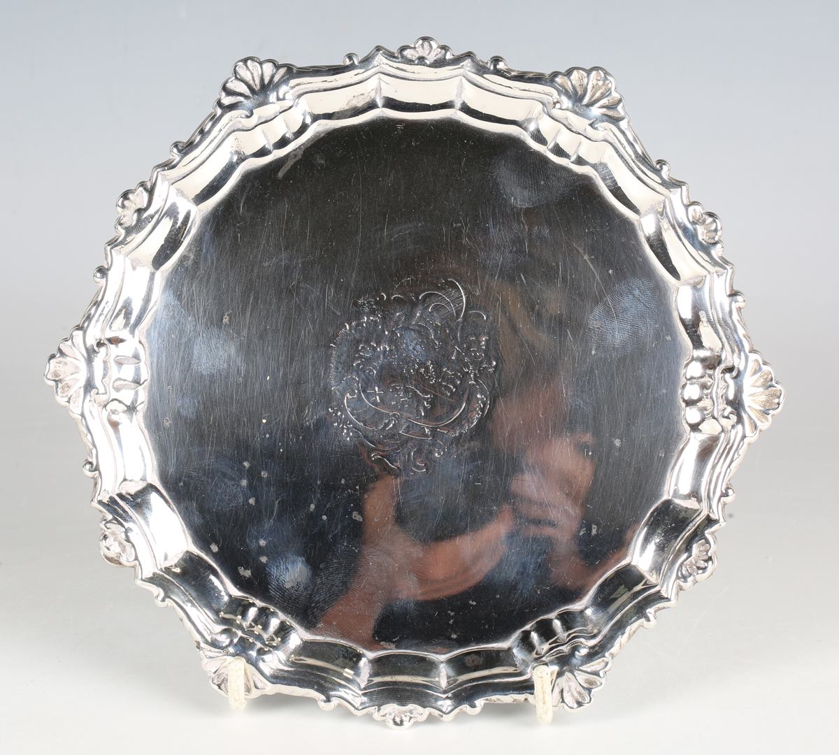 A George II silver card salver, engraved with a central armorial within a raised scroll and scalloped rim, on three pad feet, London 1745 by James Morison, weight 254g, diameter 17.5cm.