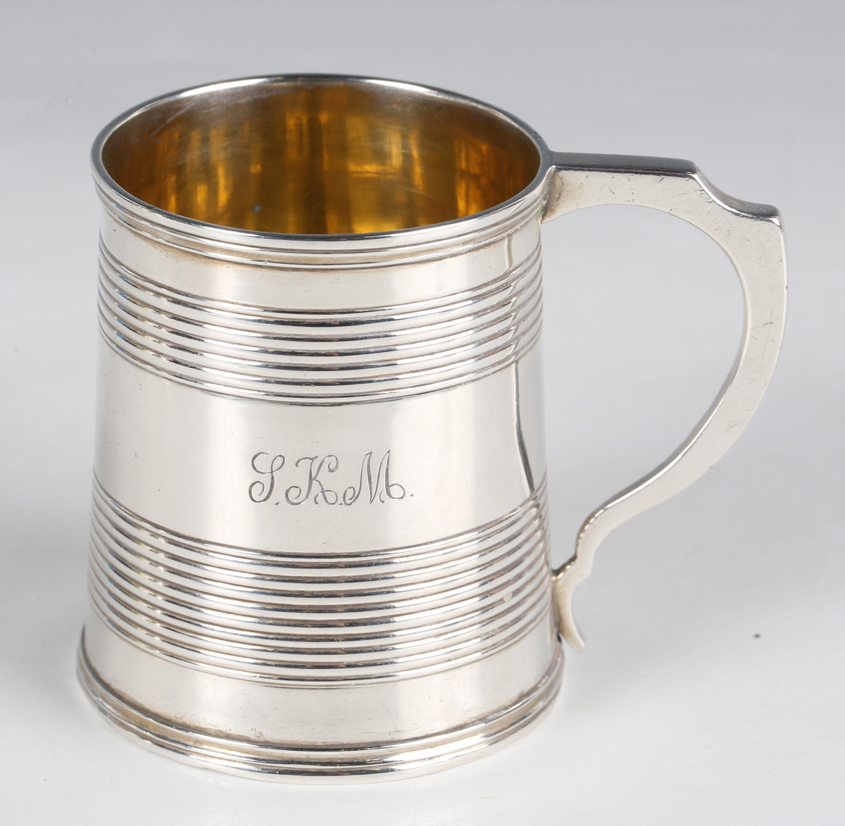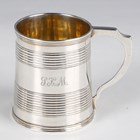 A William IV silver christening tankard of tapered cylindrical form with reeded horizontal bands and engraved initials, flanked by a scroll handle, London 1831 by Edward, Edward Junior, John & William Barnard, weight 85g, height 6.3cm.