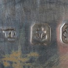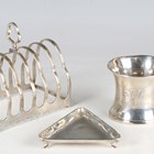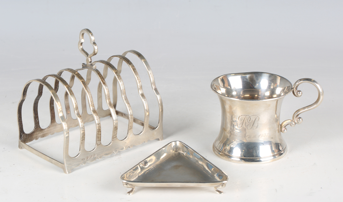 A George V silver six-division toast rack, Birmingham 1927 by I.S. Greenberg & Co, length 10.5cm, together with a silver christening tankard of waisted form, Birmingham 1929, height 6.8cm, and a silver triangular dish, Birmingham 1926, width 8.5cm, total weight 225g.
