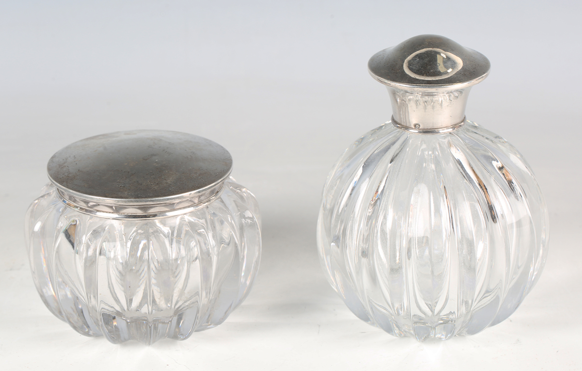A Continental silver topped cut glass scent bottle and matching jar and cover, heights 13.5cm and 8cm.