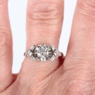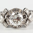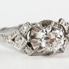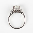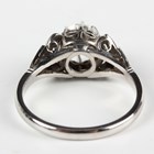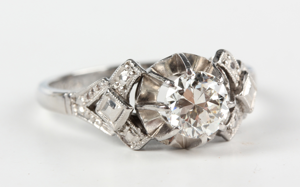 A platinum and diamond single stone ring, claw set with a circular cut diamond between decorated shoulders, detailed ‘Plat’, weight 5g, ring size approx M.