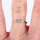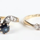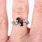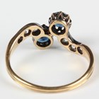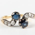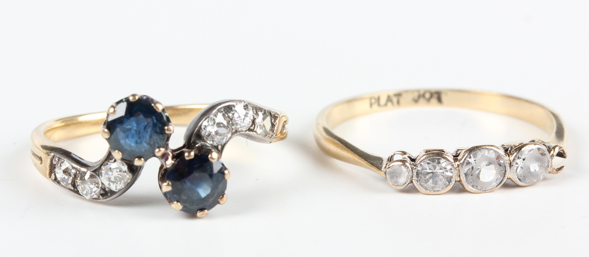 A gold, sapphire and diamond ring, claw set with two circular cut sapphires between diamond set three stone shoulders in a twist design, unmarked, ring size approx M1/2, and a gold, platinum and colourless gem set ring, detailed ‘9ct Plat’, ring size approx N1/2 (one colourless gem lacking), total weight 3.7g.