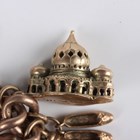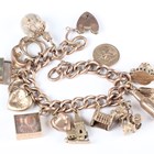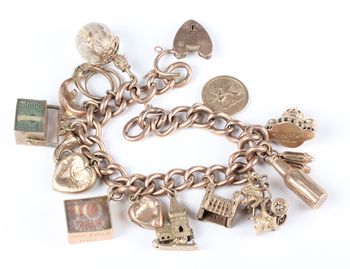 A 9ct gold curblink bracelet, fitted with fourteen 9ct gold charms, including 'Brighton Pavilion', a 'Guinness' bottle, a vintage car, a St Christopher, a one pound note and a ten shilling note, also fitted with a clown charm, unmarked, on a 9ct gold heart shaped padlock clasp, total weight 68.3g, length 21.5cm.
