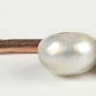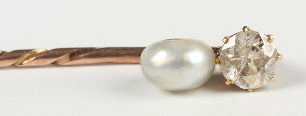 A gold, diamond and pearl stickpin, claw set with a cushion shaped diamond above a single pearl, weight 1.8g, with a case.