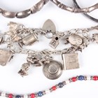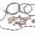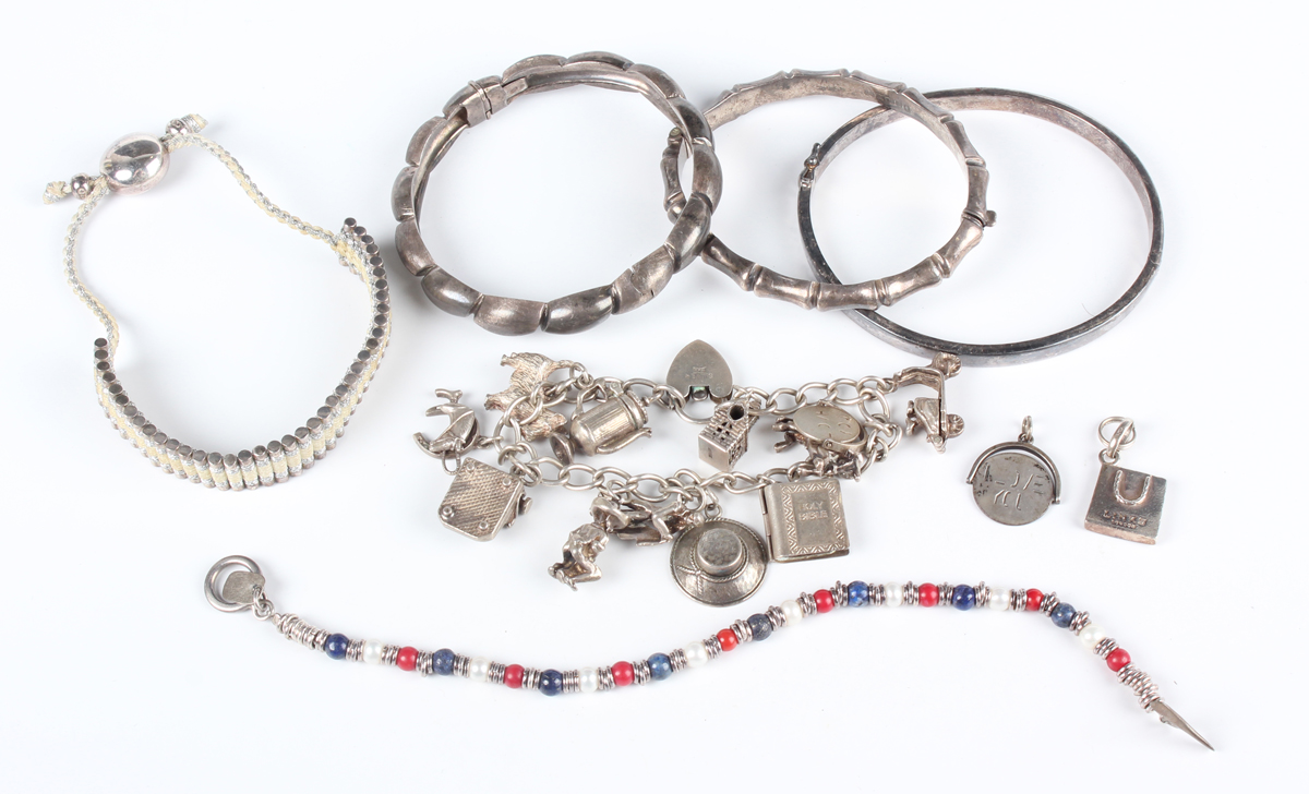 A group of mostly silver jewellery, comprising a charm bracelet, two loose charms, two further bracelets and three bangles.