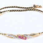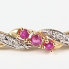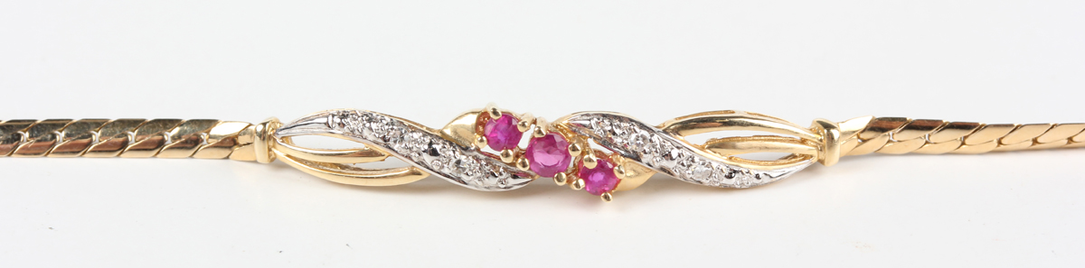 A gold, ruby and diamond bracelet, claw set with a row of three circular cut rubies between diamond set two stone sides in a serpentine design, on a snap clasp, detailed ‘585’, weight 3.7g, length 18cm.