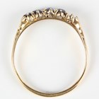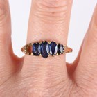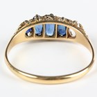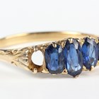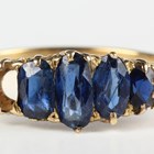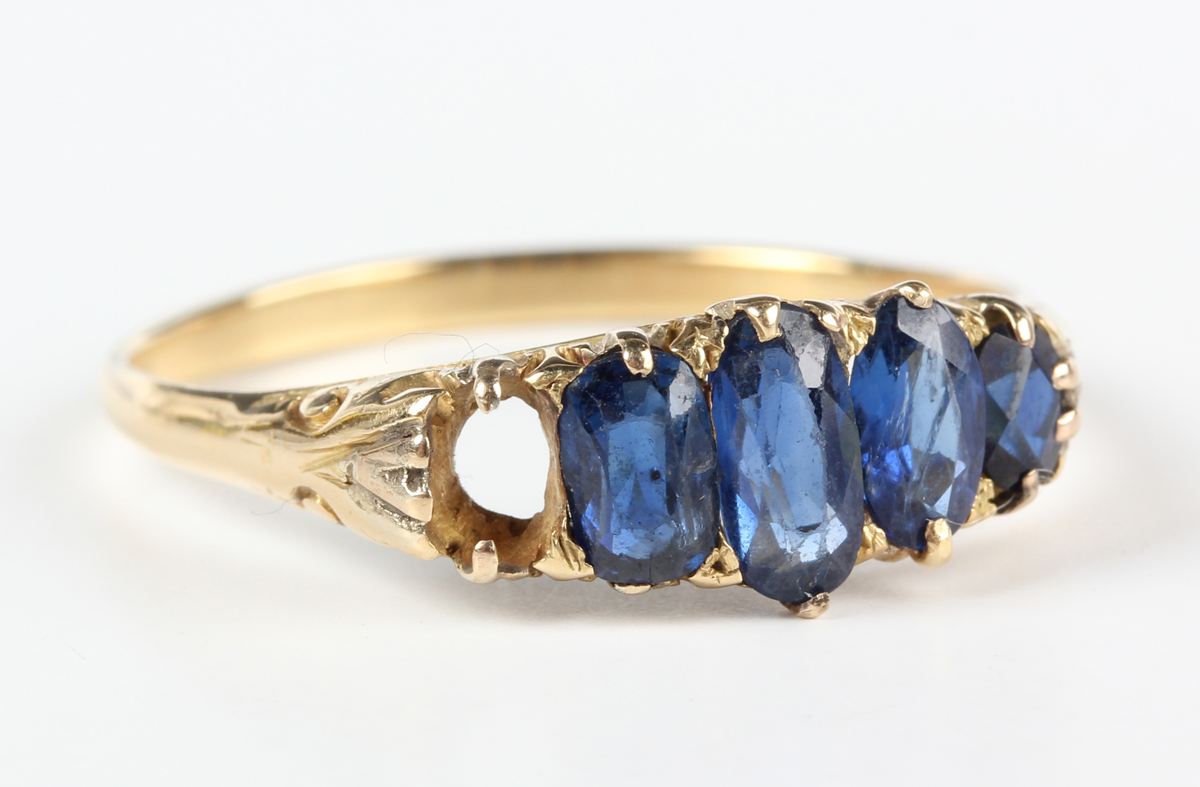 A gold ring, mounted with four graduated oval cut sapphires, detailed '18ct', weight 4.3g, ring size approx Z1/2 (one sapphire lacking).