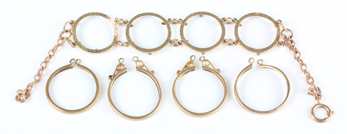 A 9ct gold bracelet mount for four half-sovereigns, on a boltring clasp, length 19cm, and four 9ct gold sovereign mounts, total weight 10.3g.