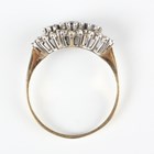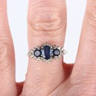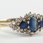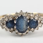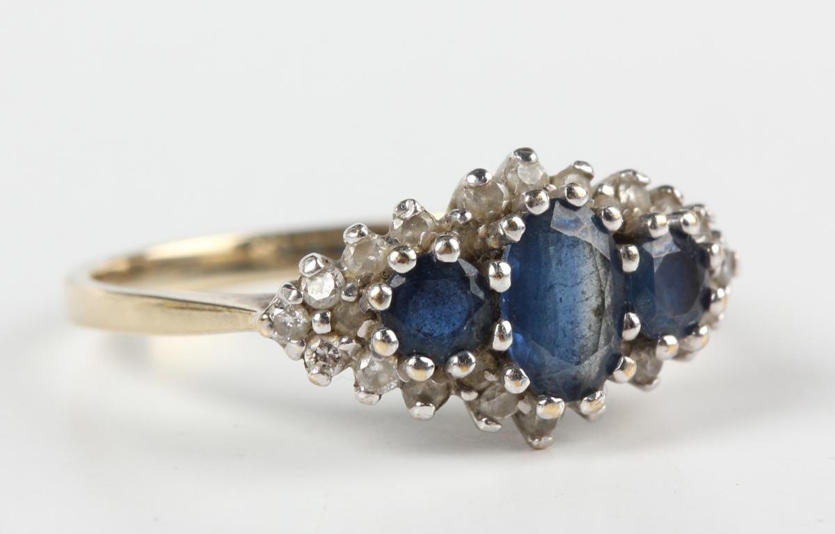 A 9ct gold ring, claw set with an oval cut sapphire between two circular cut sapphires within a surround of circular cut diamonds, detailed ‘25pts’, weight 2.3g, ring size approx O.