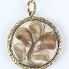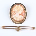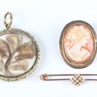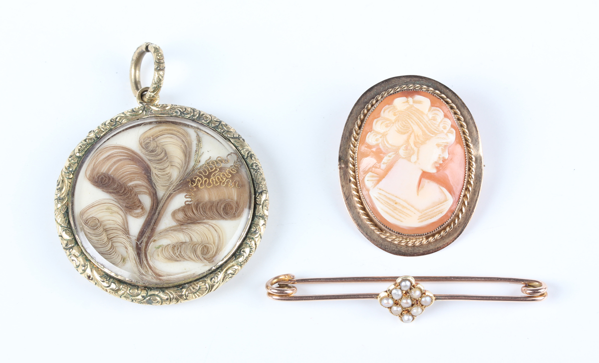 A Victorian circular gilt pendant locket, glazed with a woven hairwork spray to one side and monogram engraved to the other, length 4.8cm, a gold and seed pearl cluster bar brooch, detailed ‘15ct’, weight 1.8g, width 4.5cm, and a 9ct gold mounted oval shell cameo brooch, carved as a portrait of a lady, weight 4.2g, width 2.5cm.