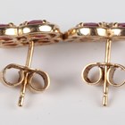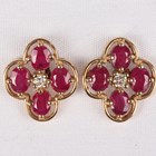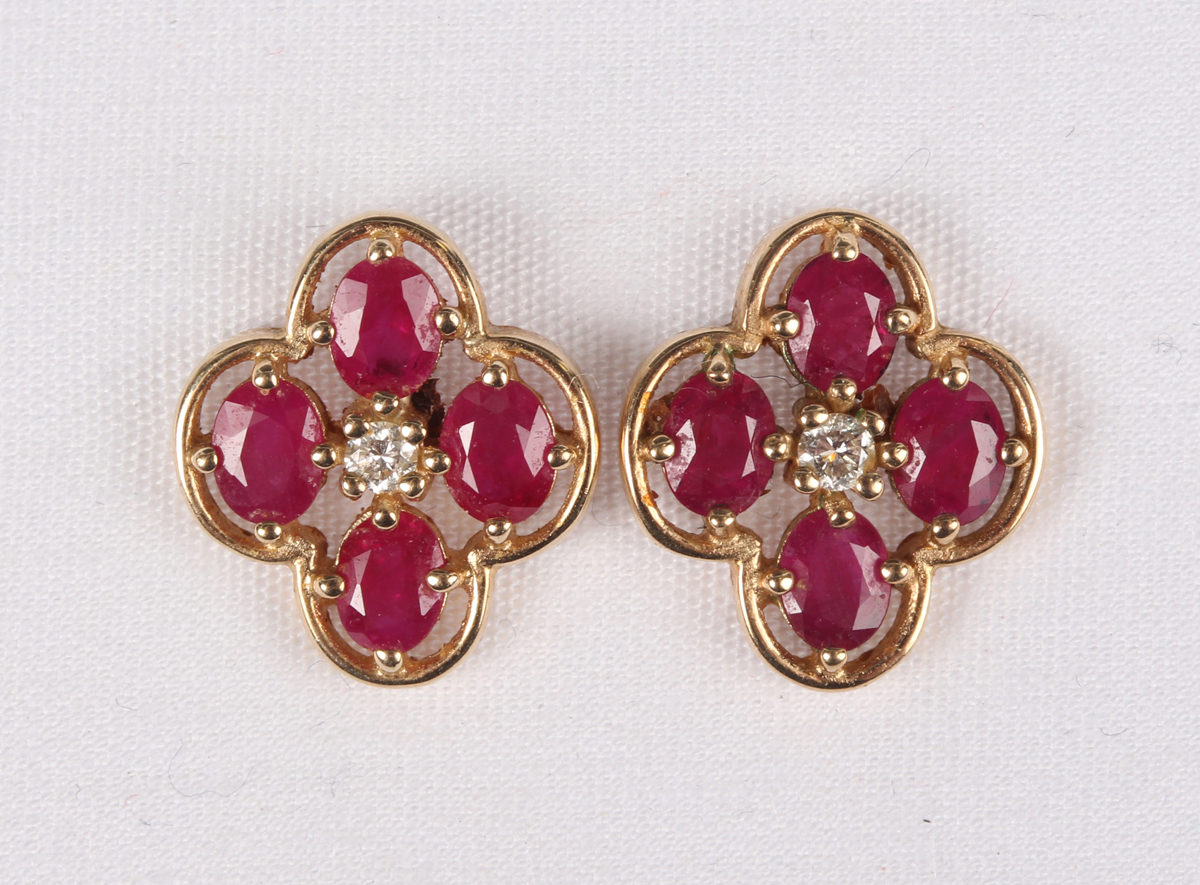 A pair of 9ct gold, ruby and diamond five stone quatrefoil cluster earstuds, each mounted with a circular cut diamond within a surround of four oval cut rubies, with post and butterfly fittings, total weight 2.4g, length 1.3cm.
