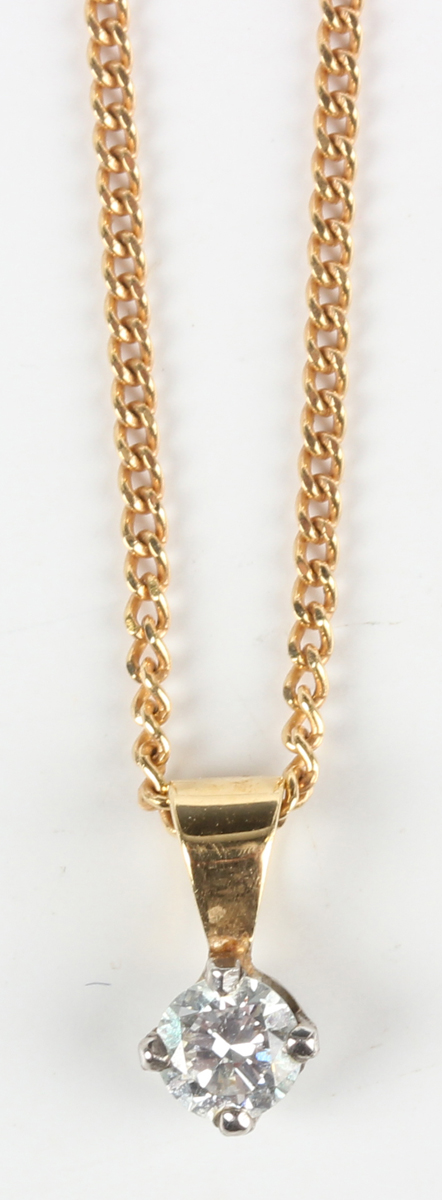 A gold and diamond single stone pendant, claw set with a circular cut diamond, length 8mm, on a 9ct gold curblink neckchain with a boltring clasp, length 41cm, total weight 1.6g.