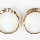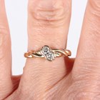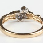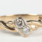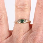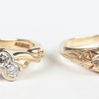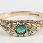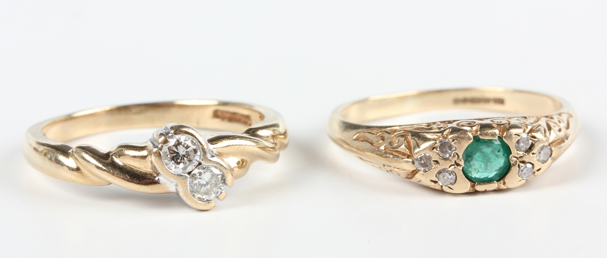 A 9ct gold ring, mounted with a circular cut emerald between diamond set three stone sides, ring size approx M, and a 9ct gold and diamond two stone ring, mounted with circular cut diamonds in a twist design, detailed ‘.20ct’, ring size approx M, total weight 5.2g.