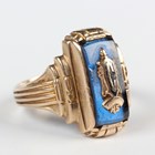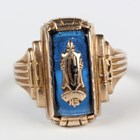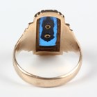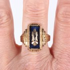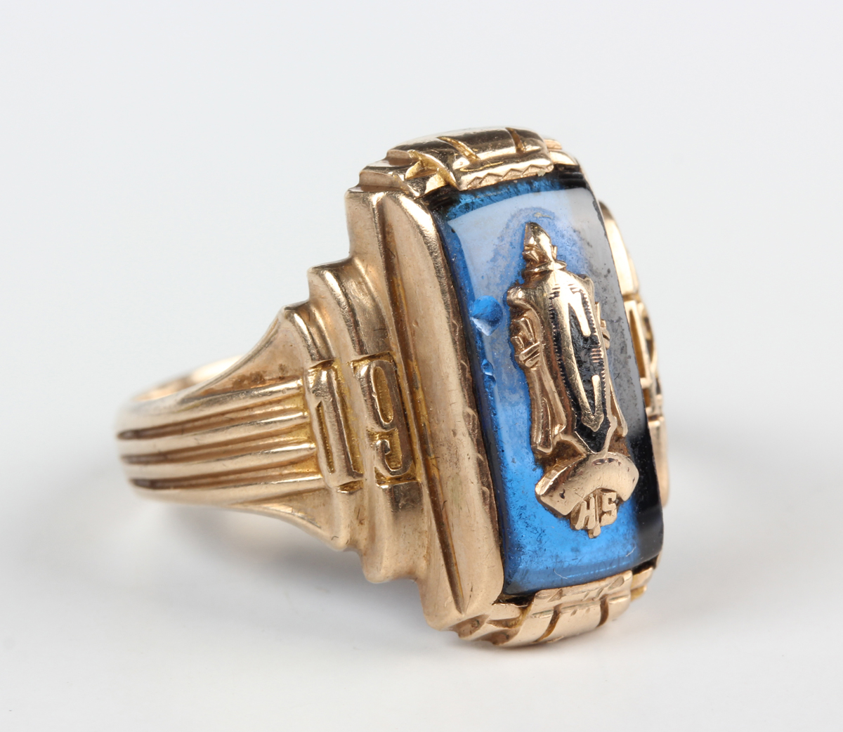 An American gold and synthetic blue gem set college style ring, detailed ‘1942 10K’, weight 7g, ring size approx T.