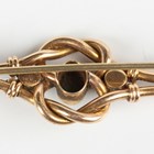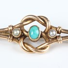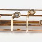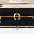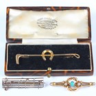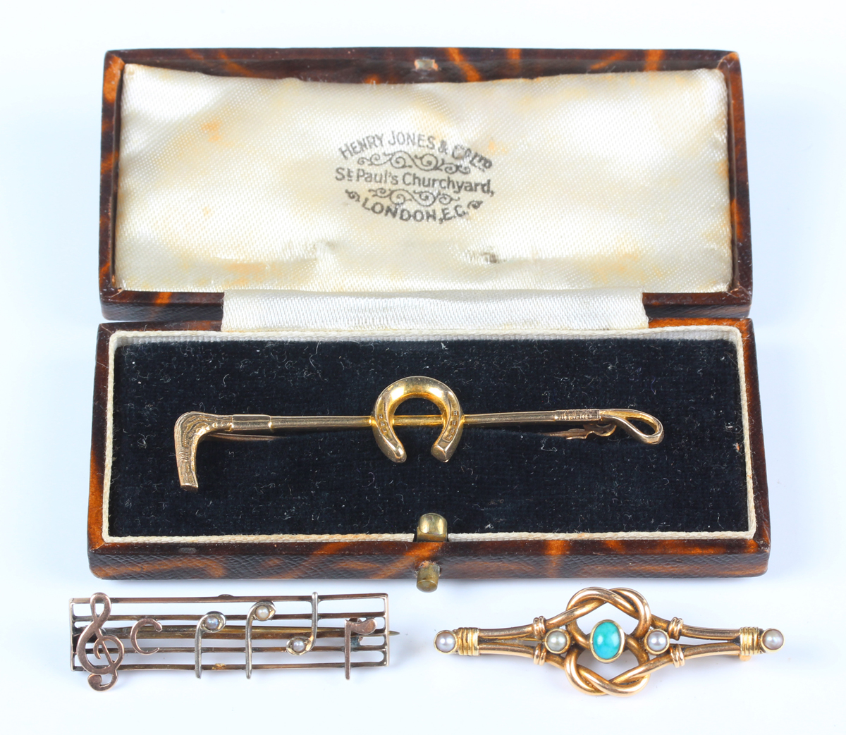 A 9ct gold bar brooch in the form of a horseshoe and whip, detailed 'H.G & S 9ct', weight 3.9g, length 6.1cm, cased, a gold, seed pearl and turquoise set bar brooch of entwined scroll form, unmarked, weight 5g, and a gold brooch in the form of a bar of music notes, weight 3.2g.