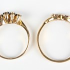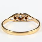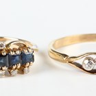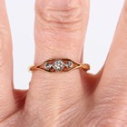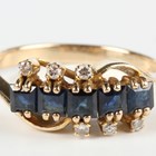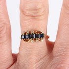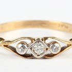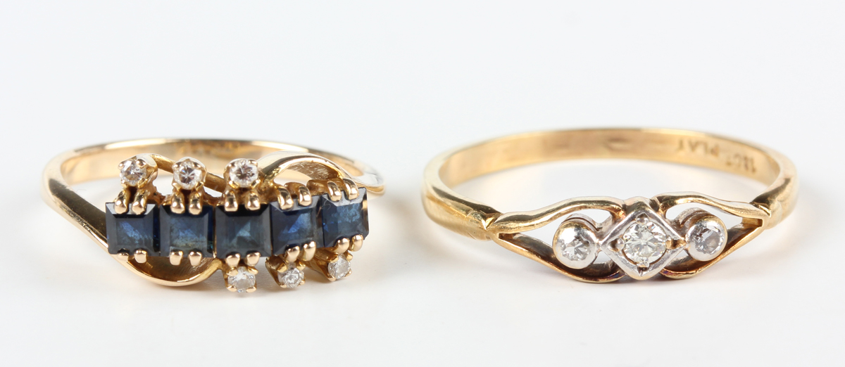 A gold, platinum and diamond three stone ring in an openwork design, detailed ‘18ct plat’, ring size approx R1/2, and a gold, sapphire and diamond ring, mounted with a row of five square cut sapphires and two rows of three circular cut diamonds in a twist design, detailed ‘750’, ring size approx K1/2, total weight 5.5g.