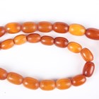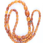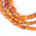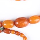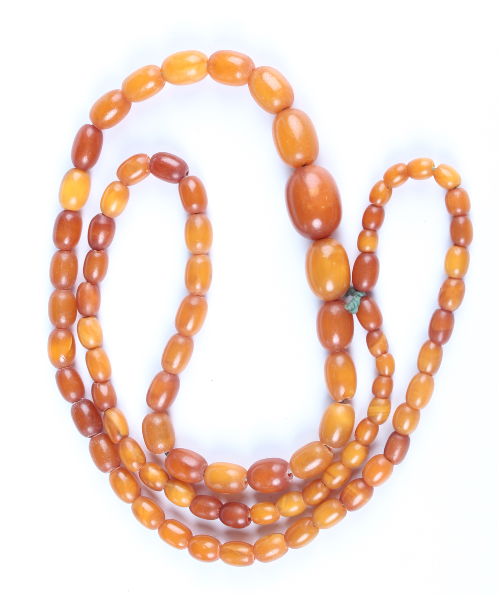 A single row necklace of eighty-three graduated oval varicoloured mottled opaque butterscotch coloured amber beads, gross weight 34.5g, length of smallest bead 6mm, length of largest bead 2cm, total length 84cm, with a case.