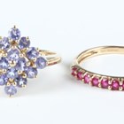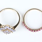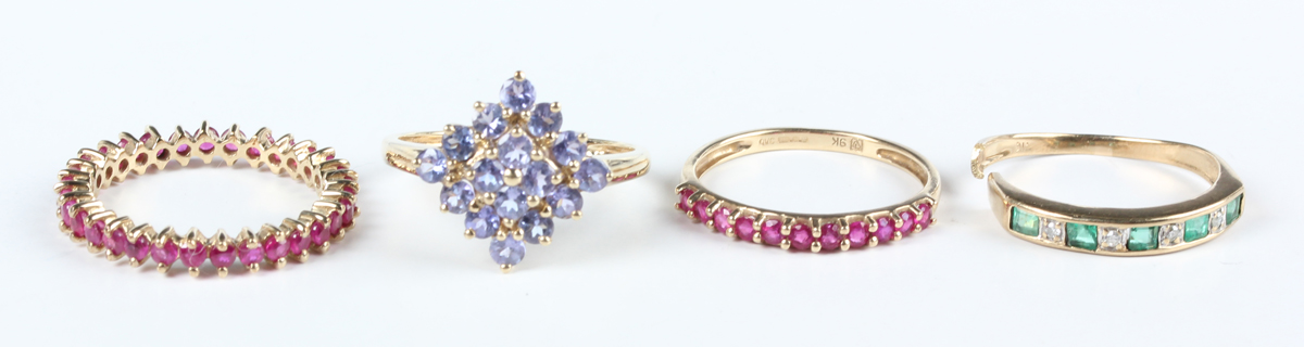 A gold and ruby full eternity ring, detailed ‘9k’, ring size approx O1/2, a 9ct gold and ruby half eternity ring, ring size approx O1/2, a 9ct gold and mauve gem set square cluster ring, ring size approx P1/2, and a gold, emerald and diamond half hoop ring (shank split), total weight 6.9g.