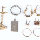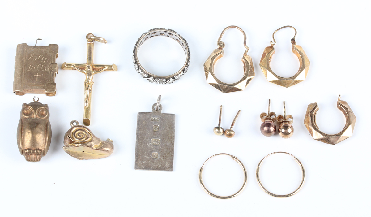 A 9ct gold crucifix pendant, length 3.7cm, three 9ct gold charms, comprising an owl, a 'Holy Bible' and a snail, four pairs of 9ct gold earrings and studs, and another 9ct gold single earring, total weight 12.6g, together with a 9ct gold and silver eternity ring, ring size approx R, and a silver ingot pendant, length 2.5cm.