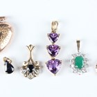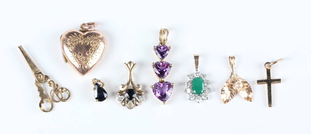 A gold and amethyst three stone pendant, designed as a row of graduated hearts, detailed ‘9k’, length 2.6cm, a 9ct gold, sapphire and diamond pendant, a gold back and front heart shaped pendant locket and four further 9ct gold pendants and charms, total weight 6.3g, and another pendant, unmarked.