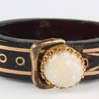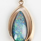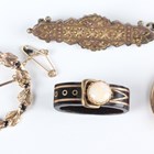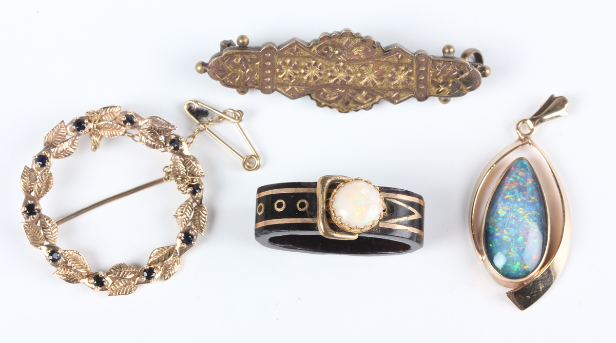 A gold and opal triplet drop shaped pendant, detailed '9ct', length 3.5cm, a 9ct gold and sapphire brooch, designed as a foliate wreath, total weight 6.4g, a Victorian gilt metal brooch and an opal set scarf clip in a buckle and strap design.