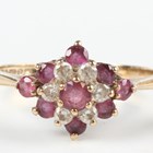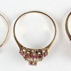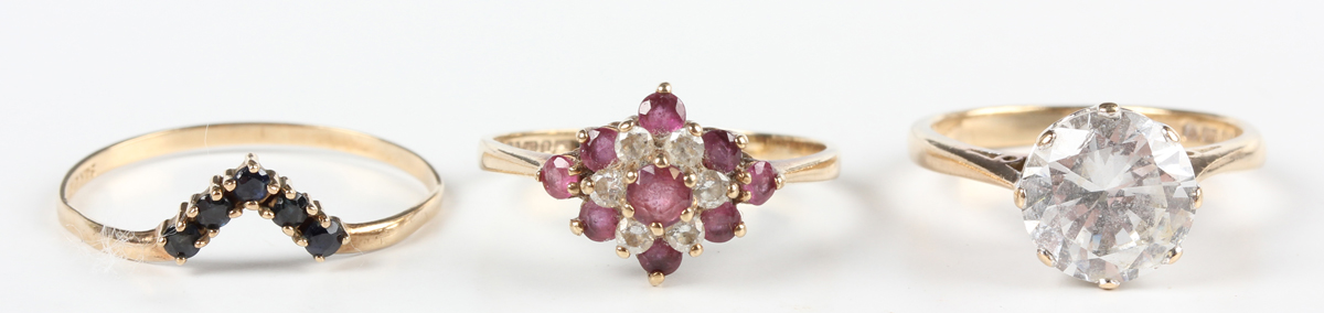 A 9ct gold and colourless gem set solitaire ring, ring size approx L1/2, a 9ct gold and sapphire five stone ring in a ‘V’ shaped design, ring size approx R, and a 9ct gold, red and colourless gem set cluster ring, ring size approx O, total weight 5.9g.