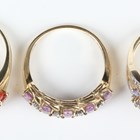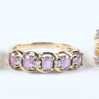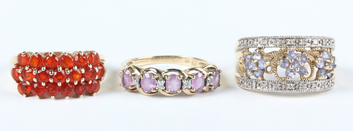 A 9ct gold ring, mounted with three rows of circular fire opals, ring size approx O1/2, a 9ct gold, diamond and pale mauve gem stone set ring, designed as three flowerheads, with diamond set sides, ring size approx P1/2, and a 9ct gold ring, mounted with five oval cut amethysts alternating with four small circular cut diamonds, ring size approx N1/2, total weight 8.9g.