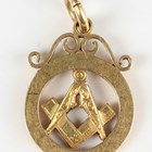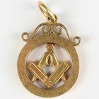 A gold Masonic pendant fob of circular form, pierced with a square compass, detailed '18ct', weight 5.5g, diameter 1.7cm.