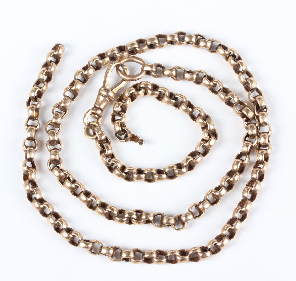 A gold circular link neckchain on a swivel clasp, detailed ‘9c’, weight 14.2g, length 49cm (chain broken).