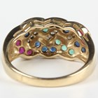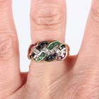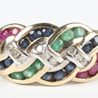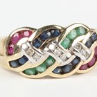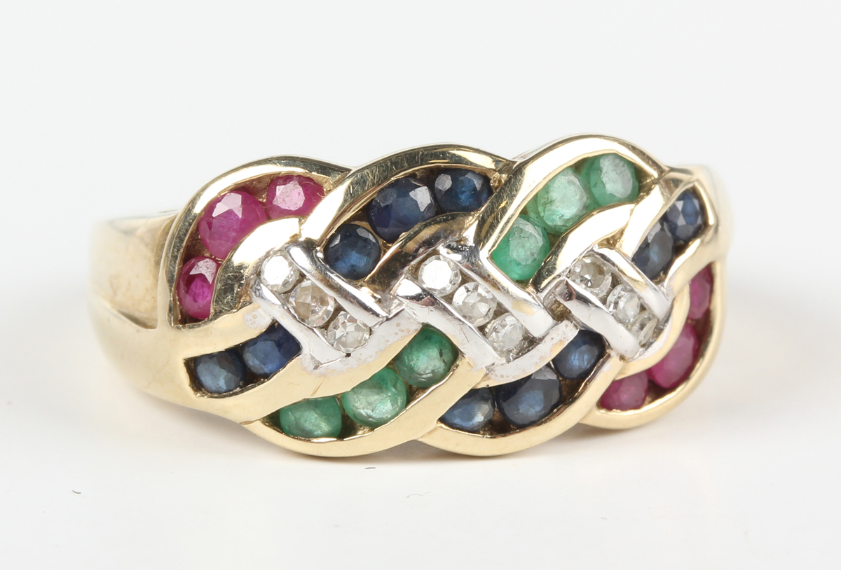 A 9ct gold, diamond, emerald, ruby and sapphire ring in an entwined design, weight 4g, ring size approx O1/2.