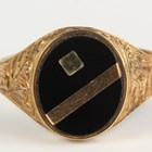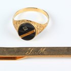 A 9ct gold tie slide, engraved with initials, Birmingham 1989, and a 9ct gold and black onyx signet ring, ring size approx V, total weight 9.5g.