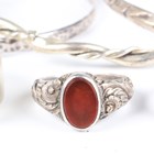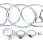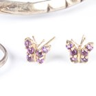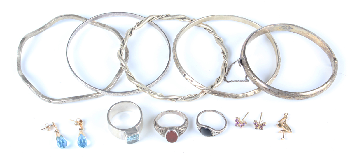A pair of gold and amethyst earstuds, designed as butterflies, detailed ‘9K’, with post fittings, a pair of gold mounted pale blue gem pendant earrings with butterfly fittings, detailed ‘375’, a 9ct gold charm, designed as a stork, total weight 3.7g, and a group of mostly silver jewellery, comprising three rings and five bangles.