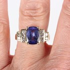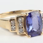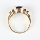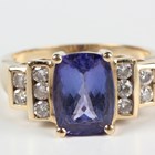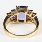 A 14ct gold, tanzanite and diamond ring, claw set with a cushion shaped tanzanite between diamond set five stone stepped shoulders, weight 6.1g, ring size approx O1/2, with a case.