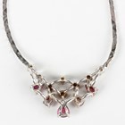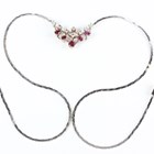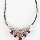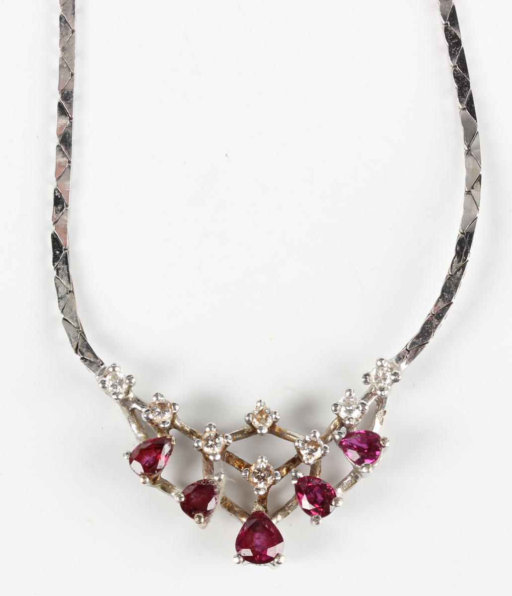 An 18ct white gold, ruby and diamond necklace, the front claw set with five pear shaped rubies, otherwise mounted with eight circular cut diamonds, on a snap clasp, detailed ‘750’, weight 10.5g, length 42cm.