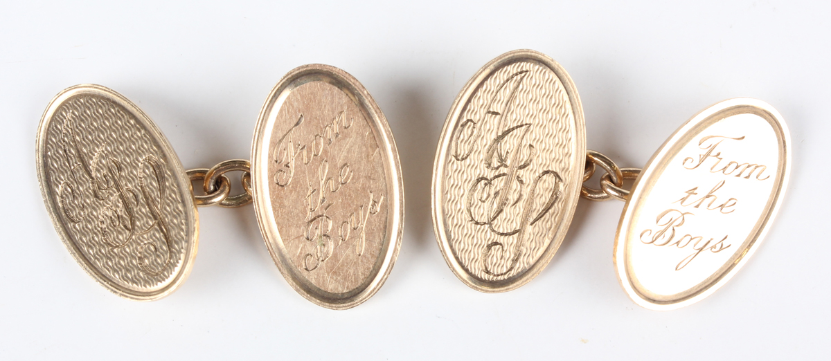 A pair of 9ct gold cufflinks, the backs detailed ‘From The Boys’, Birmingham 1989, total weight 7.8g.