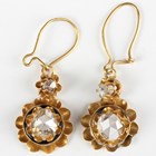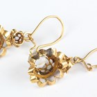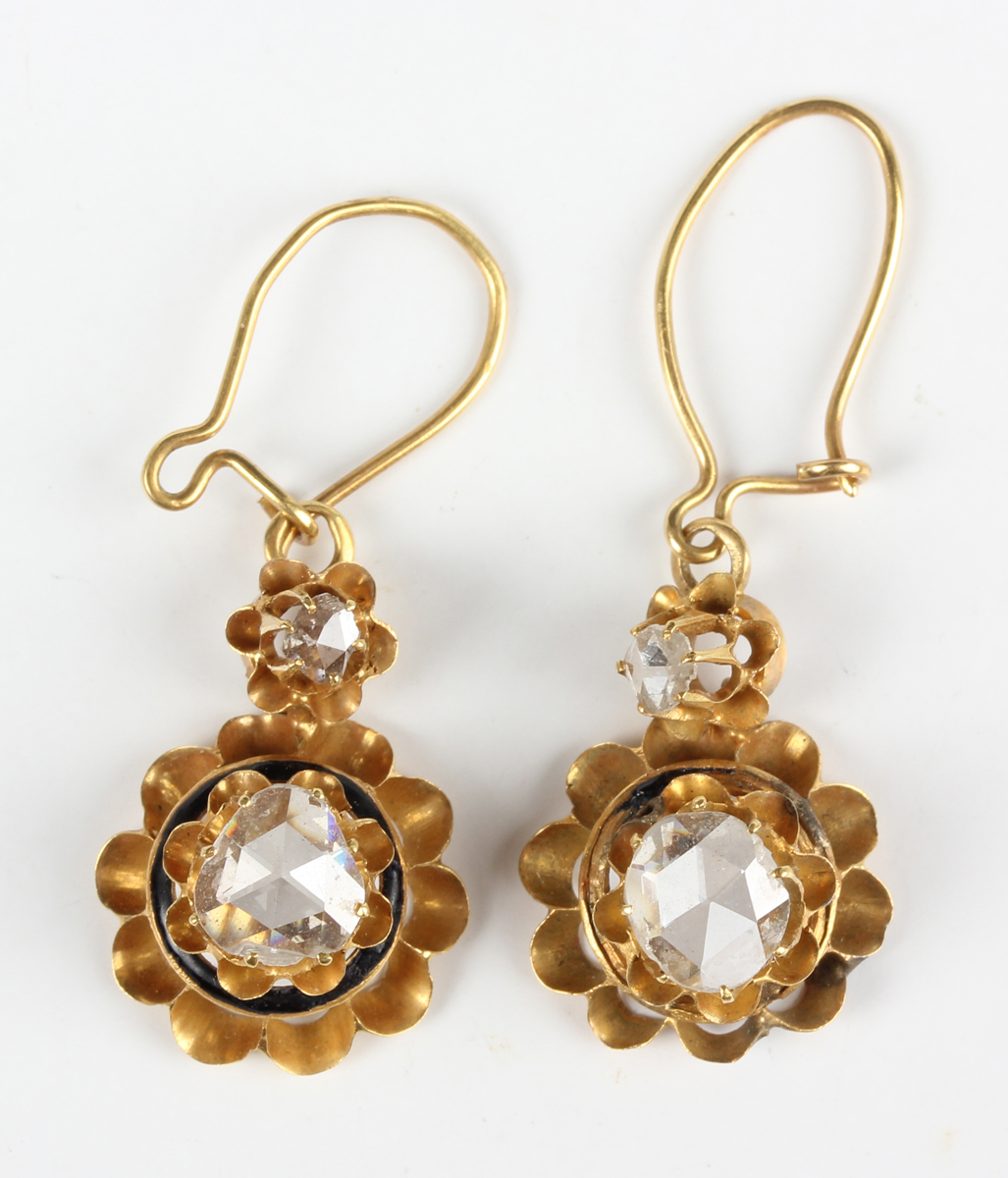 A pair of gold and rose cut diamond pendant earrings, each claw set with the principal rose cut diamond to the drop with a smaller rose cut diamond surmount, with wire fittings, unmarked, total weight 3g, length 3.5cm.