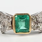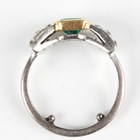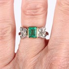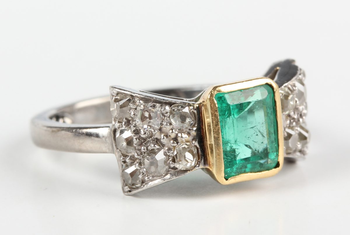 An emerald and diamond ring, mounted with a rectangular cut emerald between diamond set seven stone sides, designed as a bow, unmarked, weight 5.6g, ring size approx K1/2 (note sizing beads).
